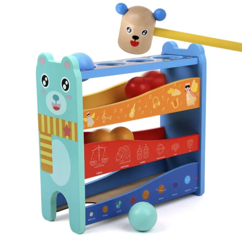 Παιχνίδι με σφυρί και μπάλες. Το παιδί χτυπάει με το σφυρί τις μπάλες και αυτές κυλάνε στο διαδρομάκι που κατηφορίζει μέχρι την έξοδο. Με αυτό το παιχνίδι το παιδί κατανοεί το αποτέλεσμα του χτυπήματος και της βαρύτητας. Παρακολουθεί την μπάλα μετά το χτύπημα να κατεβαίνει το κάθε επίπεδο, περνώντας από τις τρύπες.