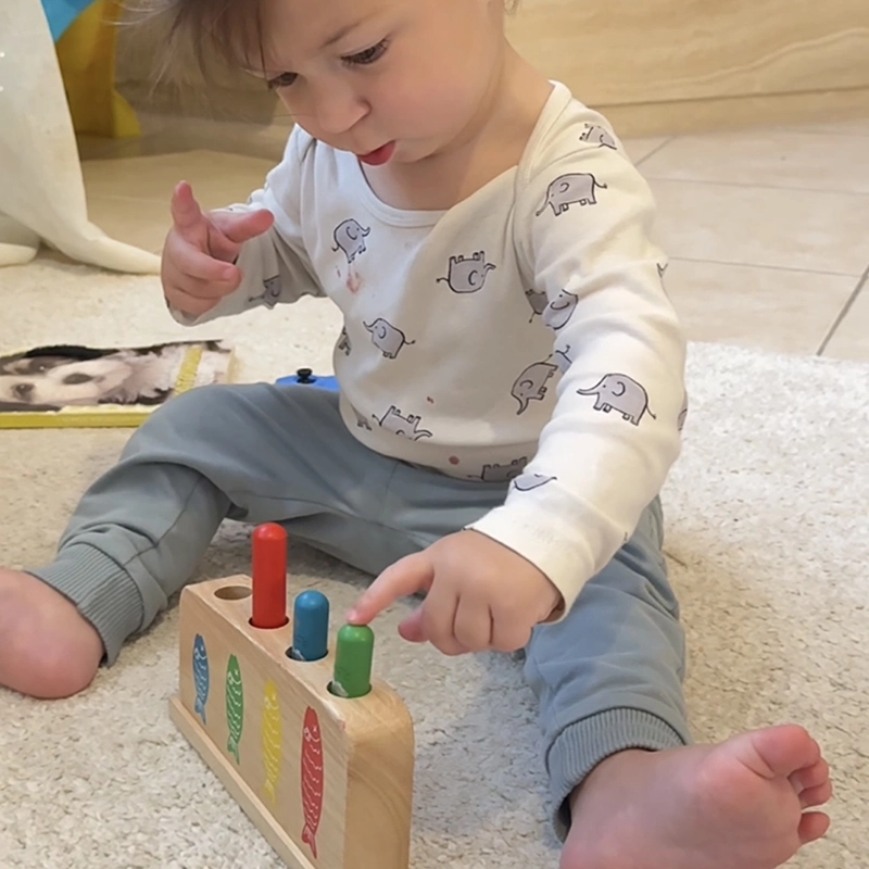 Στο παιχνίδι αυτό τα παιδιά δυναμώνουν τα δαχτυλάκια τους, μαθαίνουν τα χρώματα και όλα αυτά διασκεδάζοντας. Παιχνίδι συντονισμού ματιών-χεριών.