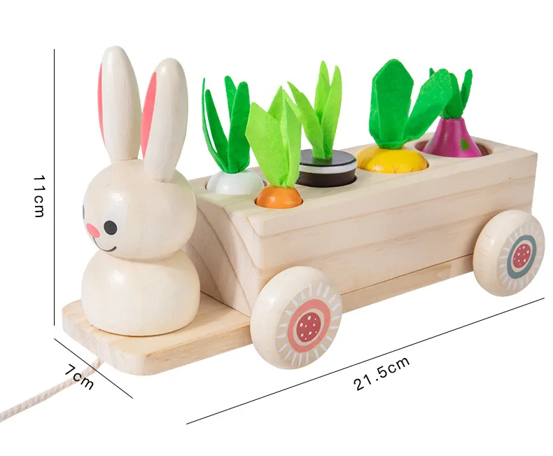 Ξύλινη τρεχαλίτσα: Ο λαγός με το καρότσι του. Ξύλινο παιχνίδι ταιριάσματος μεγεθών. Έρχεται σε 2 εκδόσεις. Στη μια ο λαγός κουβαλάει ραπανάκια και στην άλλη φρούτα. Τα κομμάτια έχουν διαφορετικό μέγεθος και θα πρέπει να μπει το καθένα στη σωστή θέση. Μόλις όλα μπουν στη θέση τους η βόλτα ξεκινάει. Εξελίσσει στο παιδί την αντίληψη του χώρου ως παιχνίδι ρυμούλκησης και την κατανόηση των μεγεθών και της αντιστοίχισης. Με το παιχνίδι αυτό, το παιδί αναπτύσσει την ισορροπία του και εξελίσσει την αντίληψη του, ως παιχνίδι κατανόησης και αντιστοίχισης μεγεθών. Επίσης, βοηθά στην εκμάθηση φρούτων και λαχανικών όπως και των χρωμάτων.