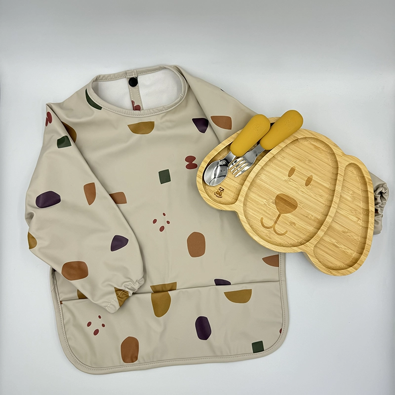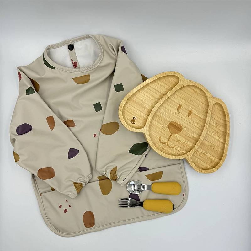 Σετ από πιάτο Μπαμπού Σκυλάκι, σαλιάρα μακρυμάνικη Spots και βρεφικά κουταλοπίρουνα σε Mustard απόχρωση.