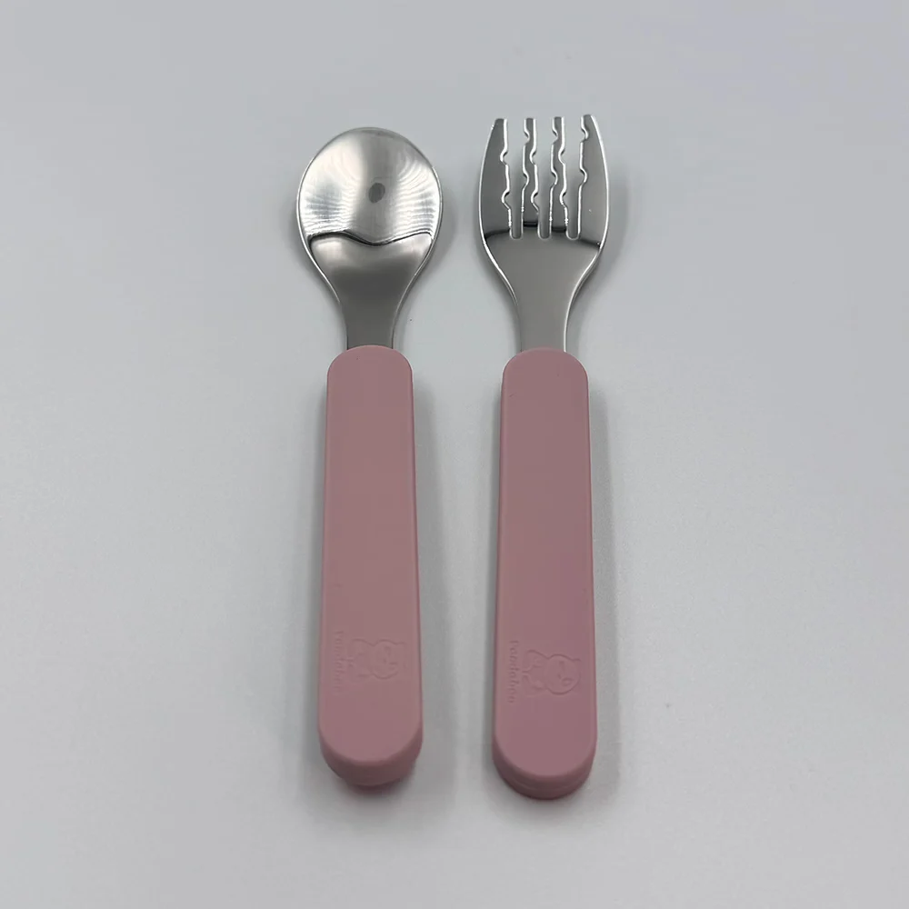 Το σετ περιλαμβάνει ένα πιάτο σε σχήμα κουκουβάγιας με τρία χωρίσματα, ένα μπολ και παιδικά κουταλοπίρουνα, σε απόχρωση dusty pink.