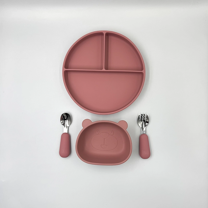 To σετ περιλαμβάνει ένα πιάτο με τρία χωρίσματα, ένα μπολ σιλικόνης panda και ένα σετ κουταλοπίρουνο βρεφικό σε rose απόχρωση.